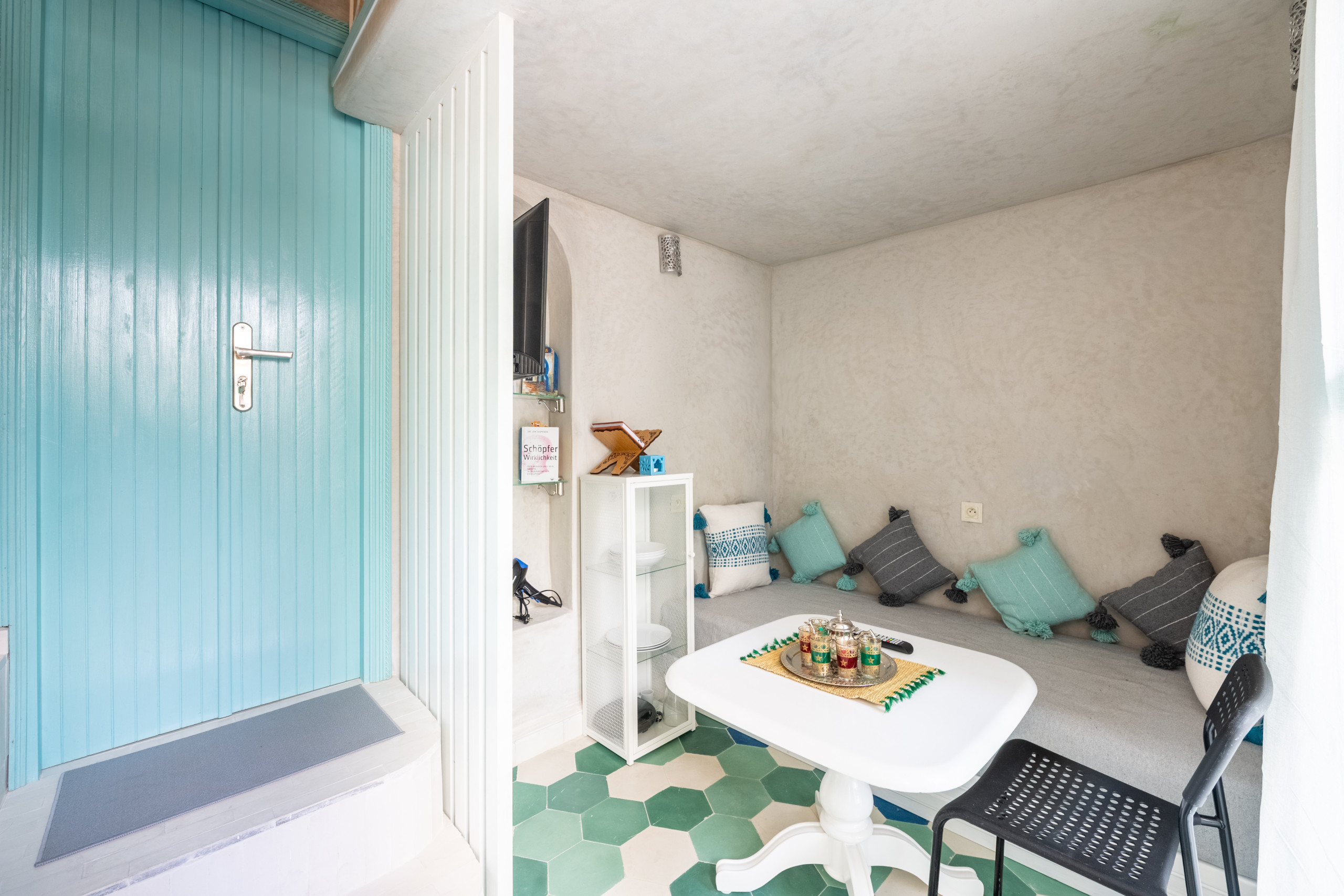 El espacio cuenta con una cama doble muy cómoda, una pequeña cocina totalmente equipada y un baño moderno con detalles artesanales marroquíes. También dispone de aire acondicionado, televisión de pantalla plana y conexión Wi-Fi de alta velocidad, ideales para una estancia corta o prolongada.