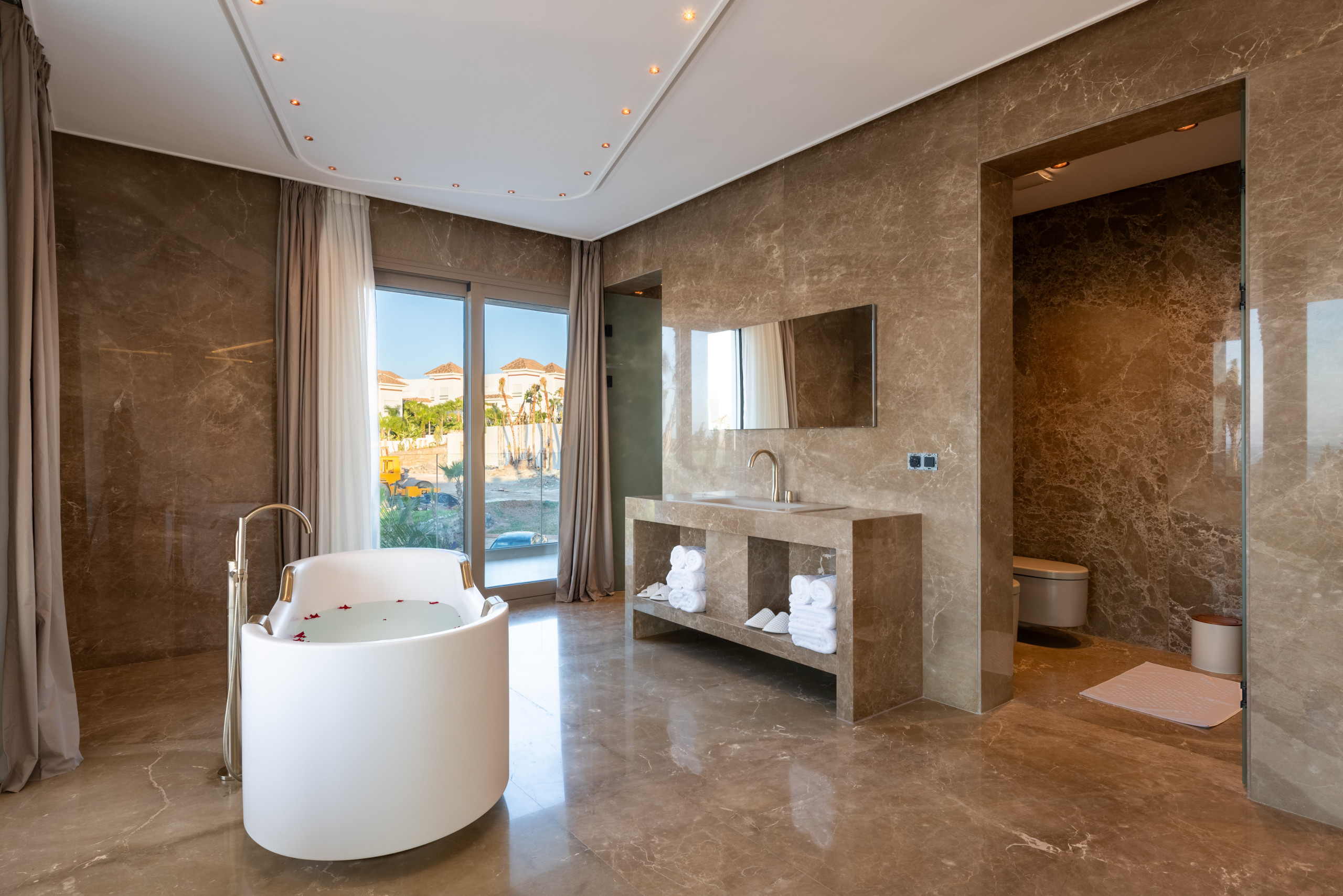 Disfrute del lujo de dos piscinas privadas, una interior y otra exterior, que ofrecen diversión durante todo el año en total privacidad. Cada villa también presume de impresionantes vistas al Mar Mediterráneo, creando una atmósfera serena e inolvidable.