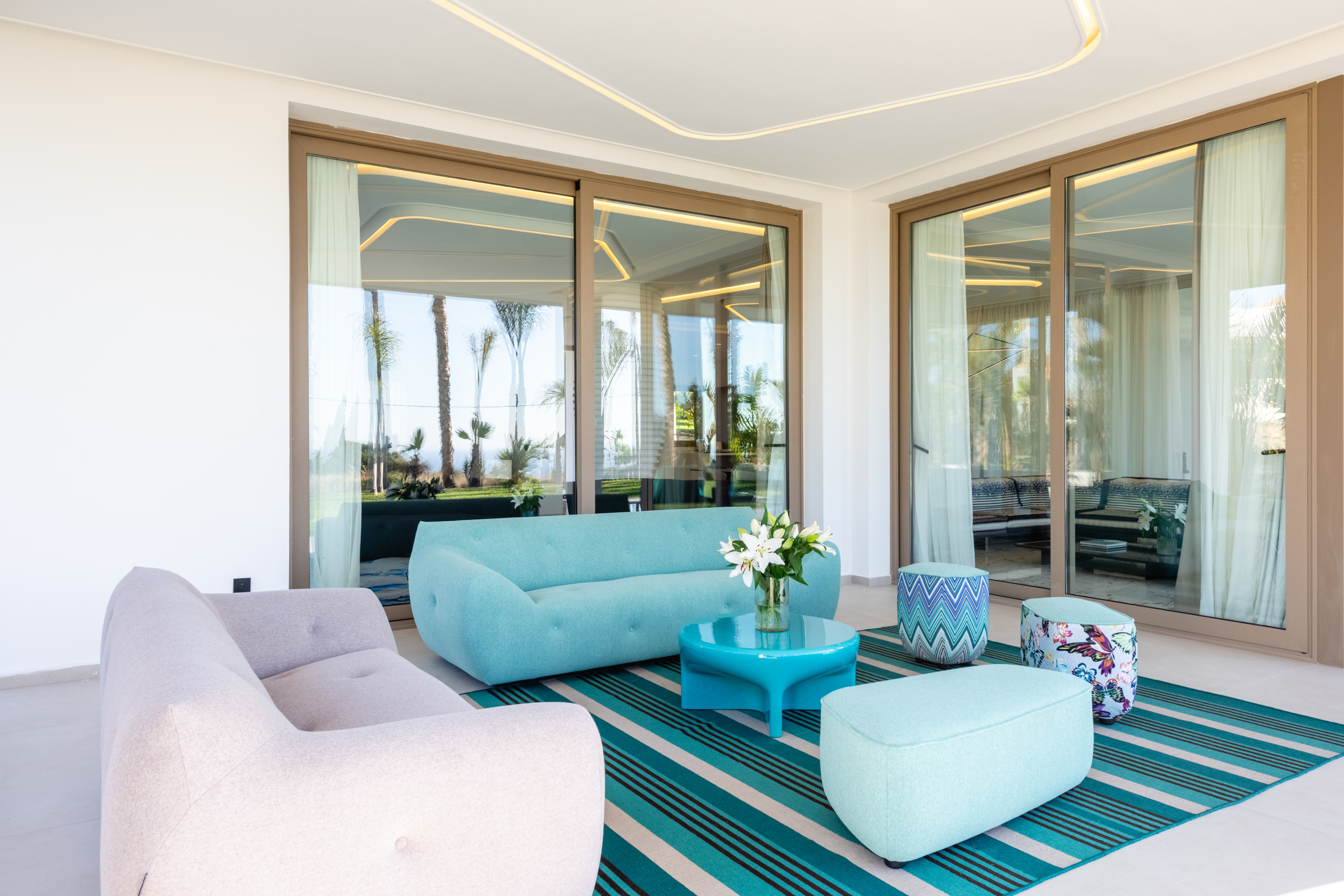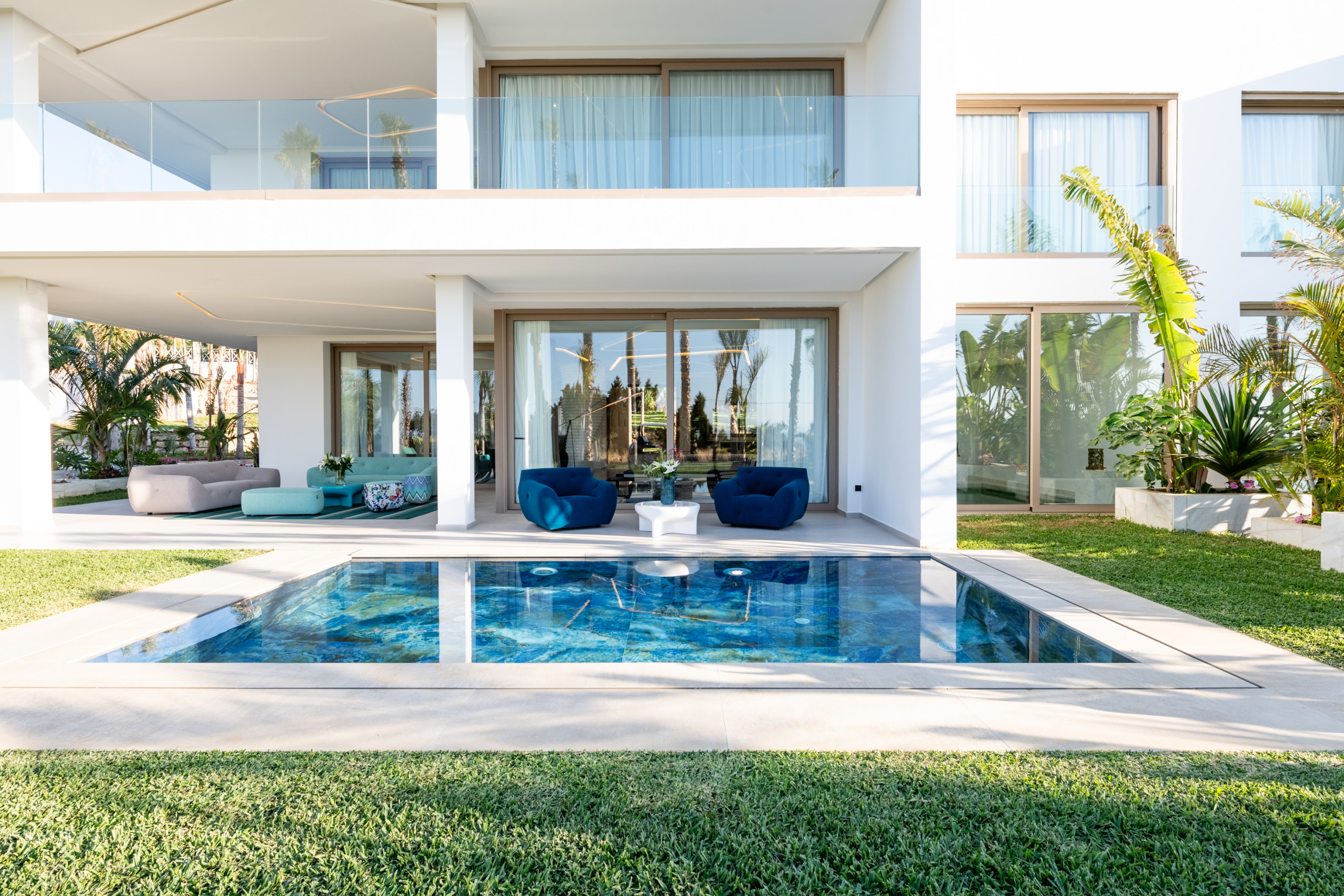 Chaque villa comprend également deux cuisines entièrement équipées, une salle de bain d'invités supplémentaire et trois grands salons imprégnés d'une touche marocaine charmante, mêlant élégance culturelle et design moderne.